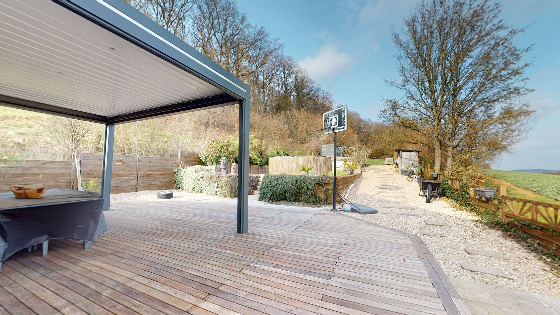 A l'extérieur, une belle grande terrasse avec Pergola Bioclimatique, piscine hors-sol, un petit cabanon et un généreux jardin clôturé à l'orée du bois, pouvant être idéal pour l'installation d'un cheval, ou autres animaux ou locations saisonnières, mais il sera possible également de réduire la parcelle de terrain, si celui-ci est trop important pour vos besoins, tout en gardant une totale indépendance et toute votre intimité, avec ajustement de prix en fonction de la surface retenue.